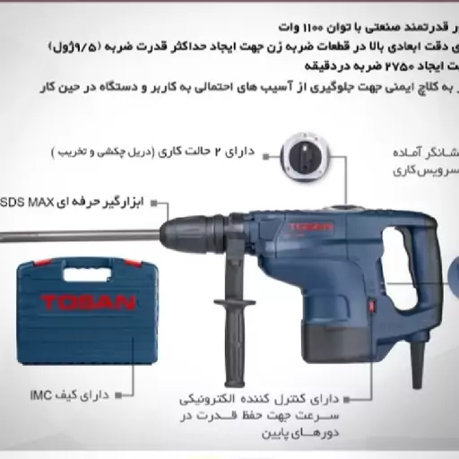 توان 800 وات واقعی انرژی هر ضربه 2/8 ژول واقعی سه حالته عملکرد دریل – دریل چکش – تخریب اورینگ های با کیفیت و مقاوم در سیستم ضربه زن ابزار گیر 4 شیار SDS-PLUS کلید برق مدل گازی شستی چپ گرد راست گرد یکسال ضمانت شرکتی توسن